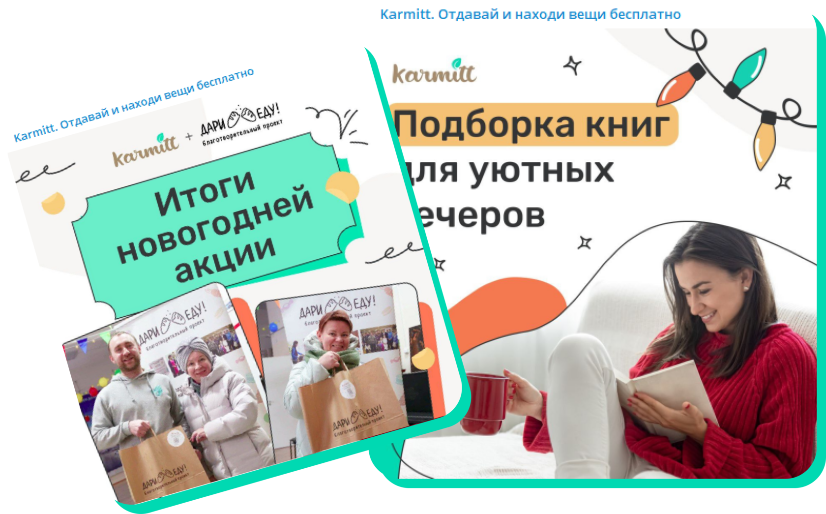 За каждую выложенную на платформе вещь в преддверии Нового года Karmitt передал в фонд продуктовый набор для нуждающихся людей. В результате акции было передано 100 наборов еды. В рамках акции были опубликованные кросс-промо материалы на сайтах, в социальных сетях и на дружественных площадках Karmitt и Дари Еду